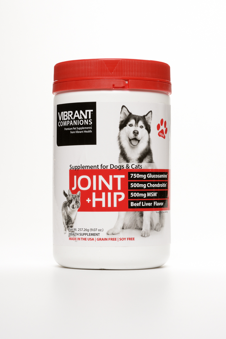 Our pets are true companions who offer us unconditional love and endless entertainment. Joint+Hip, a supplement for dogs and cats, is the first product in our brand new pet line, Vibrant Companions. It features hydrating glucosamine, MSM for flexibility, plus antioxidants & pain managing ingredients such as Boswellia serrata extract and Curcuminoids. The formulati